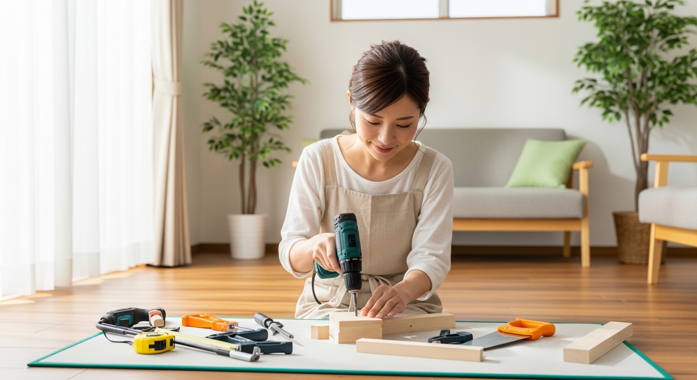 完成したDIY家具(棚やテーブルなど)を見て満足そうに微笑む日本人女性、手前にはお気に入りの財布、温かい照明