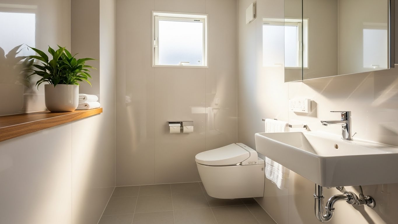 掃除が終わり、蓋が閉められ、小さな観葉植物が飾られた清潔なトイレ